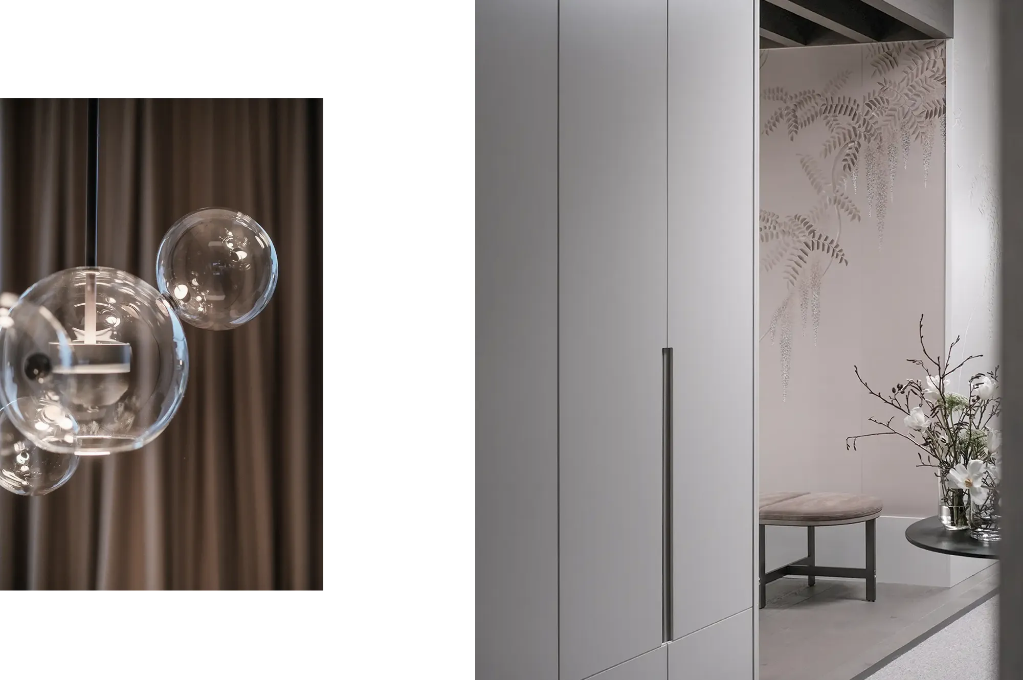 The owners had lived here for 3 years but were not entirely comfortable with the layout or the atmosphere of the apartment. The changes I proposed led to extensive structural improvements. It was important to define and separate the zones within the interior. The solution was anchored in classical proportions but without becoming a classical interior. I aimed to promote mobility and openness. Walls were removed to open up to the beautiful view, but elements like room dividers and pivot doors were also added to create clearer zones. Every part of the floor plan was considered and adapted to the overall concept.