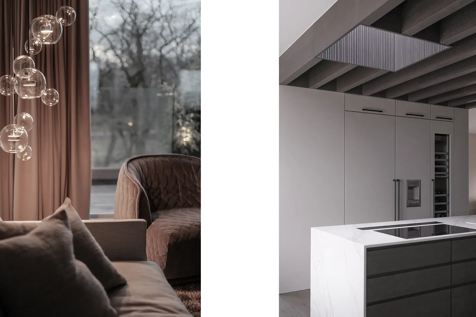 In this project, the external terrace also plays an important role. Over the years, the owners had created a beautiful green oasis here. I wanted the interior to connect with the lush vegetation on the terrace, where the green plants and pergola create intimate outdoor spaces. Therefore, I added wooden ceilings with sturdy beams in selected areas. These wooden ceilings enhance the sense of zones in the open floor plan, connect spatial elements, and recreate the intimate feeling of pergolas. I focused on creating a pleasing rhythm in the interior, and together with planned sightlines, the wooden ceilings frame the view and bring it into the interior.