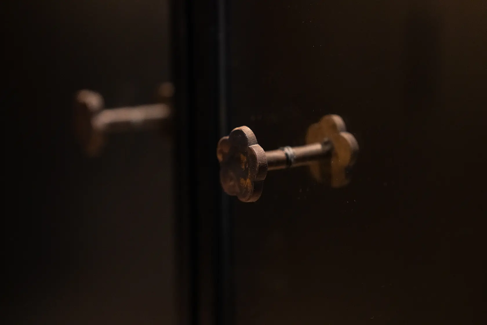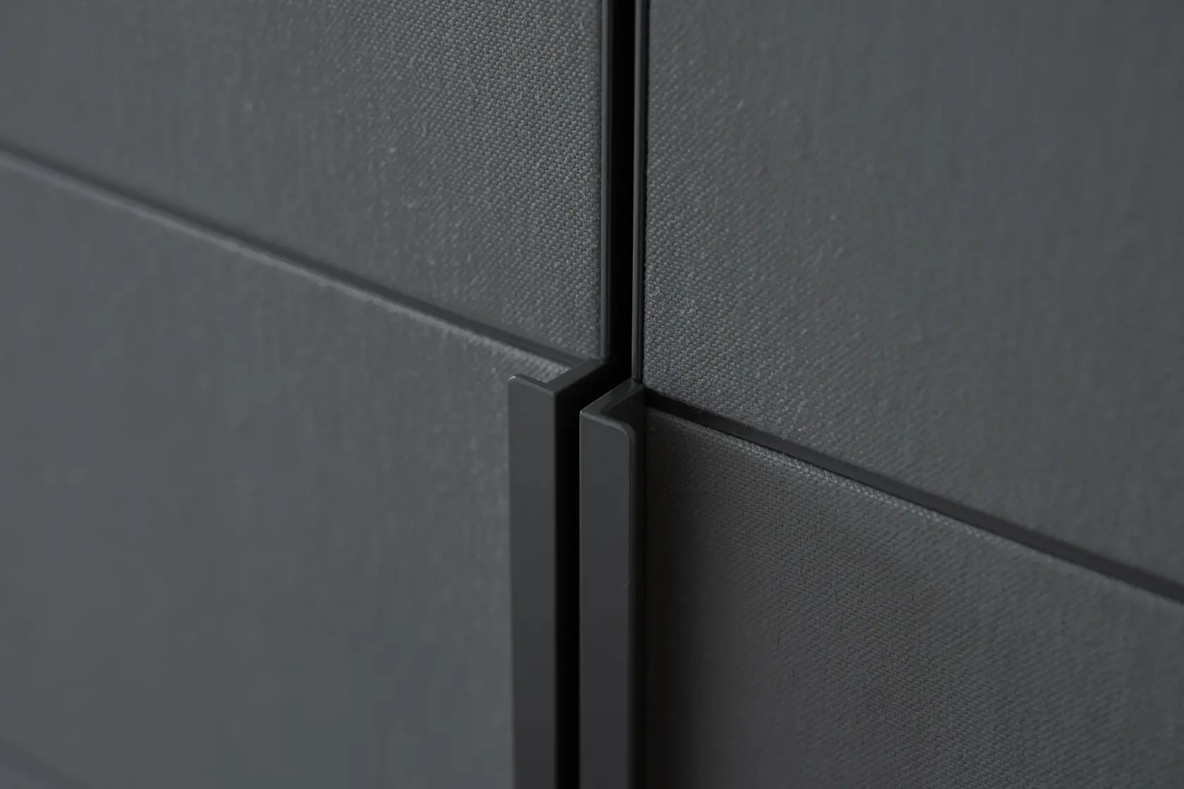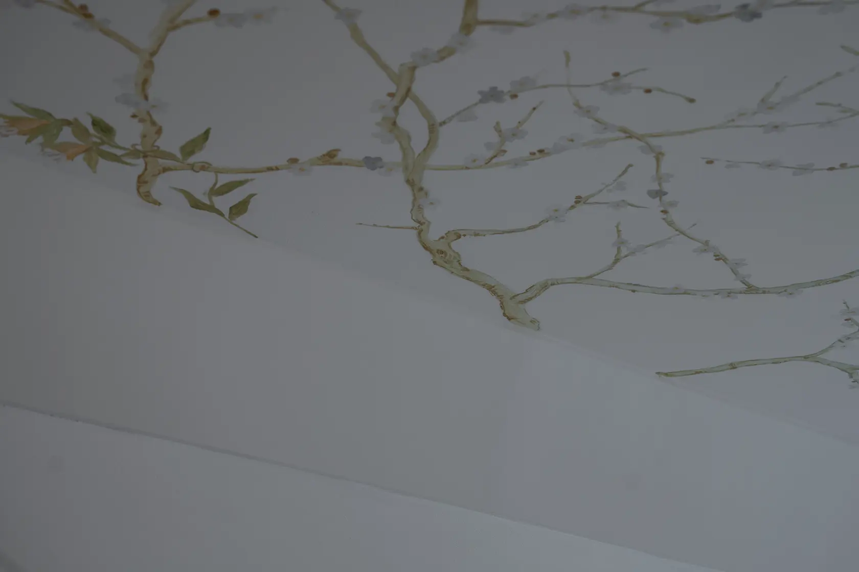 Selv med en arealstørrelse på 125 kvadratmeter er leiligheten optimalisert til det fulle, med løsninger som utnytter hver kvadratmeter på best mulig måte. Det åpne kjøkkenet og stuen fungerer som et naturlig samlingssted for varme samtaler, mens det private soverommet og kontoret er et fristed for ro og rekreasjon. Spesialdesignede taklister, som elegant buer seg innover mot rommet, rammer inn stuen og kjøkkenet med subtile detaljer. Den samme himlingslisten videreføres i master soverommet, hvor den glir inn i et håndmalt blomstermotiv i taket. Dette lyse, poetiske elementet står i vakker kontrast til de omkringliggende garderoberommene, hvor mørke, dempede tretak og vegger gir en følelse av eksklusivitet og dybde.