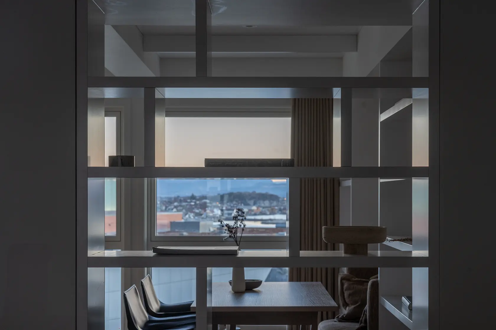 Penthouse-leiligheten på 110 kvadratmeter ligger i de to øverste etasjene av et boligbygg ved sjøkanten i Stavanger. Med panoramautsikt mot hav, fjell, park og by har beliggenheten vært et sentralt premiss for utformingen. Landskapet er trukket inn i interiøret gjennom bevisst plasserte siktlinjer, og lyset får bevege seg fritt gjennom rommene i takt med vær og årstider.