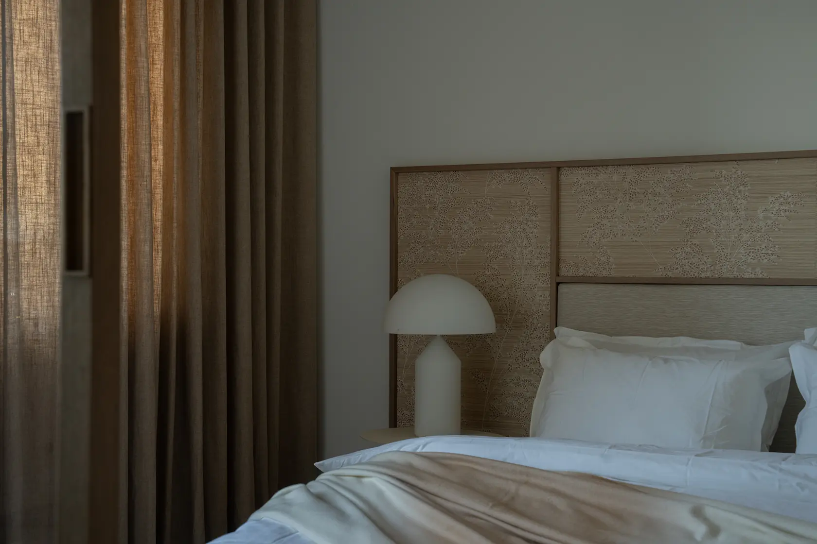 Materialpaletten er dempet og tidløs. Treverk, stein og tekstiler skaper varme og taktile kontraster, mens gjennomarbeidede himlinger med profilerte lister og paneler gir rommene dybde og karakter. I badene videreføres uttrykket gjennom trepanel, som tilfører en lun og omsluttende atmosfære.